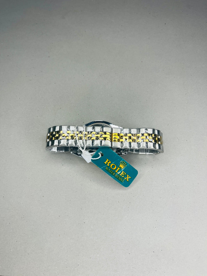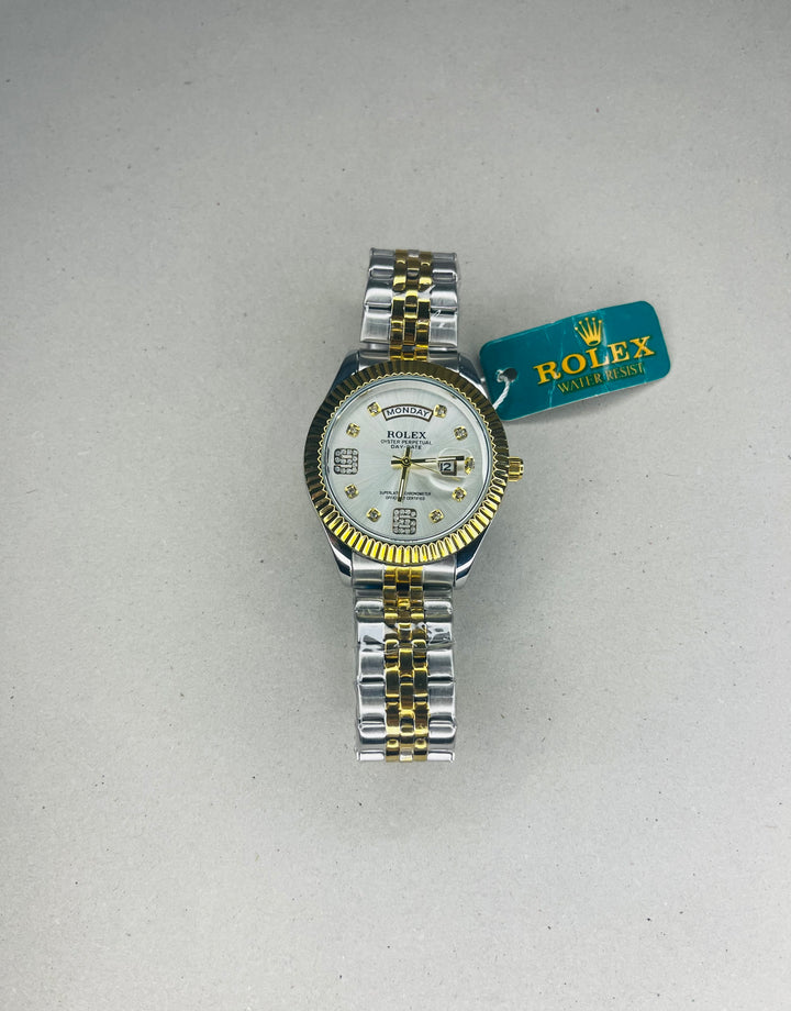 Experience timeless luxury with the Rolex Gold Watch, featuring a sleek white dial that exudes elegance and sophistication. Crafted from premium gold-tone stainless steel, this watch embodies prestige and precision. The white dial with luminous markers ensures clear readability, while the polished gold and white bracelet adds a touch of opulence to any look.